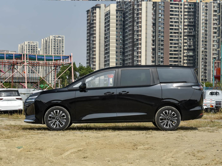再来看车身侧面部分,车身侧面采用传统MPV的平直车顶设计,C柱下方窗线上挑的细节增添了一丝灵动。4910mm的车长与2910mm的轴距,使其尺寸接近本田奥德赛,但通过1850mm的克制车宽优化了城市穿梭能力。双侧电动侧滑门(高配车型)的加入是一大亮点,隐藏式滑轨设计不仅美观,在狭窄车位也能轻松开关门,方便老人儿童上下车。不过,入门版车型仍配备手动侧滑门,但导轨的顺滑度表现优秀,单手即可完成操作。